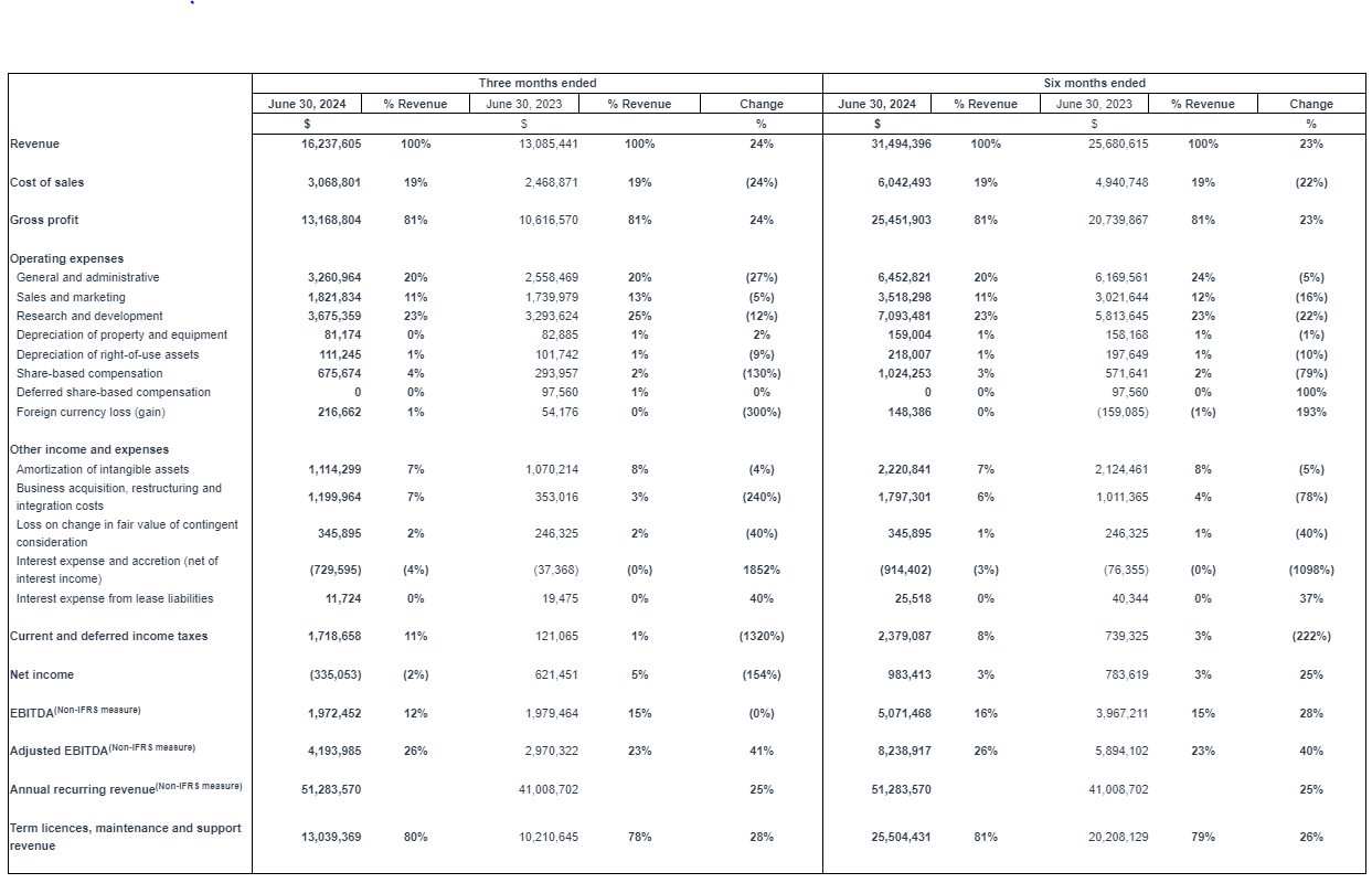 The increase in Adjusted EBITDA from Q2 2023 to Q2 2024 was primarily attributable to the higher recurring revenues of $13,039,369 in Q2 2024, as compared to $10,210,645 in Q2 2023, coupled with an ongoing effort to manage costs and gain operating cost synergies.