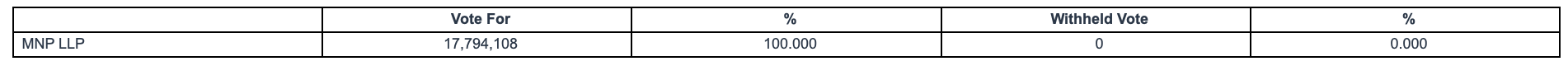MNP LLP was appointed as the Company’s auditor and the directors were authorized to fix the auditor’s remuneration.