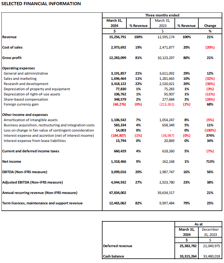 ARR ⁽¹⁻²⁾ growth was largely due to organic growth of $6,472,477 or 15%, and acquisition growth of $1,062,500 or 2%. ARR ⁽¹⁻²⁾ also benefitted by a gain of $664,508 or 1% due to the increase in the GBP rates relative to the Canadian dollar in the quarter.
