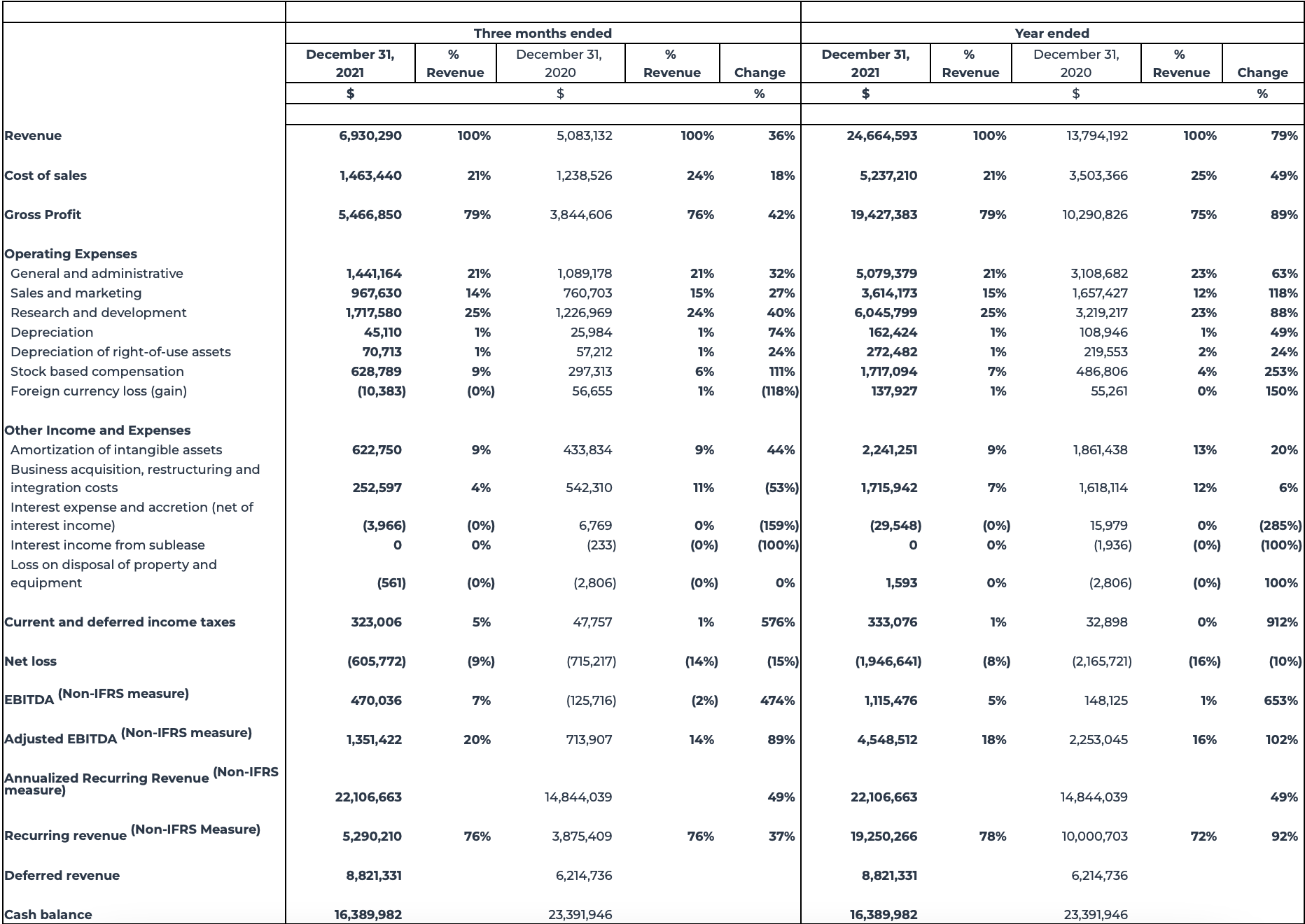 Adjusted EBITDA (2) of $1,351,422, or 20% of revenue, compared to $713,907 or 14% of revenue from the comparative period in the prior year.